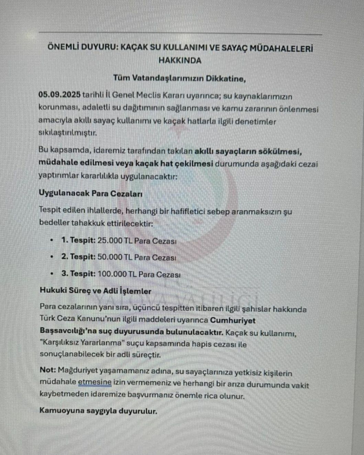 İl Genel Meclisi’nin 05 Eylül 2025 tarihli kararı doğrultusunda denetimlerin sıkılaştırıldığını duyuran Yalova Valiliği, su kaynaklarının korunması amacıyla akıllı sayaç kullanımı ile kaçak hatlara yönelik kontrollerin artırıldığı belirtti. Sayaç sökümü ve kaçak kullanım tespit edilmesi halinde ağır yaptırımların kararlılıkla uygulanacağı vurgulandı. Yazıya göre kaçak su kullanımı ve akıllı sayaçlara müdahale edenlere birinci tespitte 25 bin TL para cezası, ikinci tespitte 50 bin TL para cezası ve üçüncü tespitte 100 bin TL para cezası uygulanacak. Ayrıca para cezalarının yanı sıra üçüncü tespitten itibaren ilgili kişiler hakkında Cumhuriyet Başsavcılığı’na suç duyurusunda bulunulacağını bildirdi.