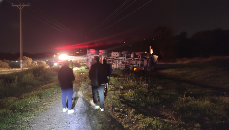 Yol kenarında yan yatan kamyonun sürücüsü kabinde sıkıştı.