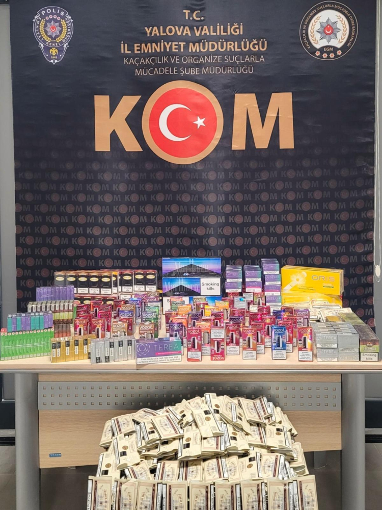 Yalova Emniyet Müdürlüğü Kaçakçılık ve Organize Suçlarla Mücadele Şube Müdürlüğünce kaçakçılığın önlenmesine yönelik yürütülen çalışmalar kapsamında 16- 20 Aralık tarihleri arasında yapılan çalışmalarda nastroy slım ibareli 20 bin 000 adet doldurulmuş makaron, waletta nıght blue ibareli 20 bin adet doldurulmuş makaron, boros red ibareli 6 bin adet doldurulmuş makaron olmak üzere toplam 46 bin adet içi kıyılmış tütünle doldurulmuş makaron ele geçirildi.