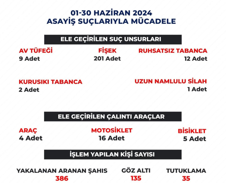 Yalova Emniyet Müdürlüğü ve Jandarma ekipleri tarafından asayiş suçlarıyla mücadele operasyonlarında 9 adet av tüfeği, 201 adet fişek, 12 adet ruhsatsız tabanca 2 adet kurusıkı tabanca ve bir adet uzun namlulu silah ele geçirildi. 4 adet çalıntı, 16 adet çalıntı motosiklet ve 5 adet çalıntı bisiklet ele geçirilirken, 386 aranan şahıs yakalandı. 135 kişi gözaltına alınırken 35 kişi de tutuklandı.