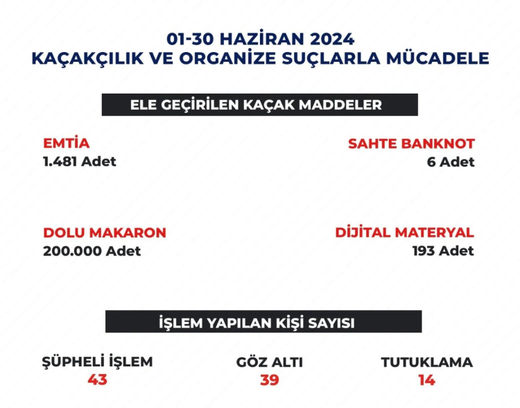 Emniyet ve Jandarma ekipleri, kaçakçılık ve organize suçlarla mücadele operasyonlarında 1481 adet emtia, 6 adet sahte banknot, 200 bin adet dolu makaron ve 193 adet dijital materyal ele geçirdi. 43 şüpheliye işlem yapılırken, 39 şüpheli gözaltına alındı. 14 kişi ise tutuklandı.