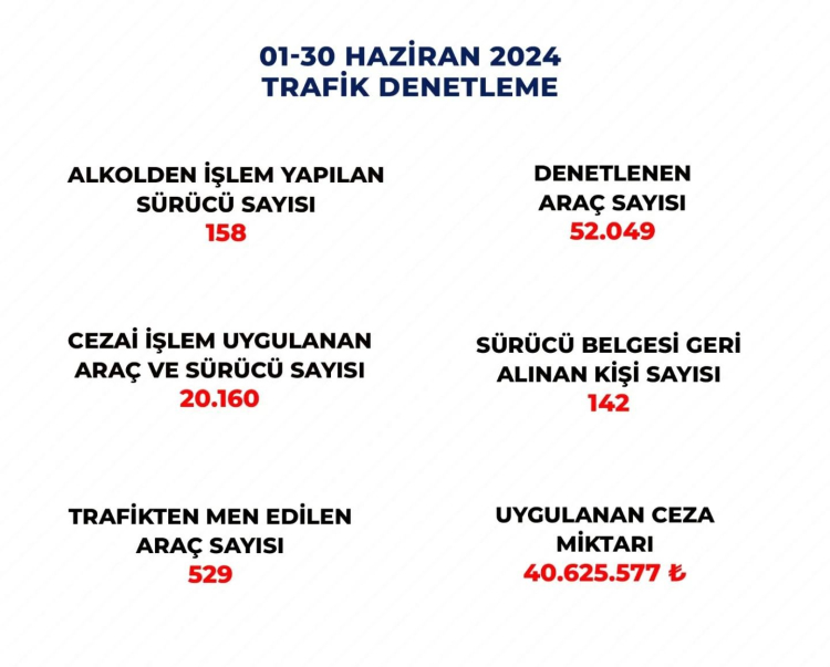 Emniyet ve Jandarma trafik ekipleri tarafından yapılan trafik denetimlerinde 158 sürücüye alkolden işlem yapıldı. 52 bin 49 araç denetlendi. 20 bin 160 araç ve sürücüsüne cezai işlem uygulanırken, 142 kişinin sürücü belgesi geri alındı. 529 aracın trafikten men edildiği denetimlerde toplamda 40 milyon 625 bin 577 TL para cezası uygulandı.