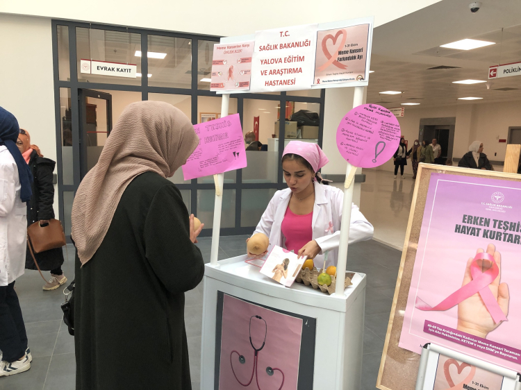 Yalova Eğitim ve Araştırma Hastanesi’nde Yalova Üniversitesi Hemşirelik Bölümü Öğrencilerinin ve Öğretim Üyelerinin desteği, Eğitim Birimi ve Kanser Erken Tanı Birimi Organizasyonu ile stant açıldı ve meme muayenesinin önemi vurgulandı.