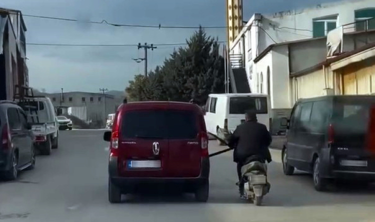Yalova’da hafif ticari araçtan uzatılan emniyet kemeri ile motosiklet çeken vatandaşlar herkesin şaşkın bakışları içinde yolculuk etti.