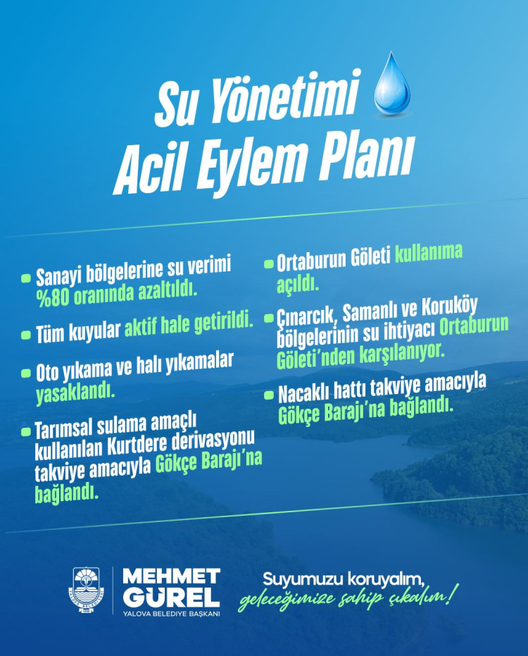 Tüm kuyular aktif hale getirildi. Oto yıkama ve halı yıkamalar durduruldu. Kurtderesi derivasyonu, takviye amacıyla Gökçe Barajı’na bağlandı. Ortaburun Göleti kullanıma açıldı. Çınarcık, Samanlı, Akköy ve Koruköy bölgelerinin su ihtiyacı Ortaburun Göleti’nden karşılanıyor. Nacaklı hattı, takviye amacıyla Gökçe Barajı’na bağlandı. Suyumuzu koruyalım, geleceğimize sahip çıkalım” diye konuştu.