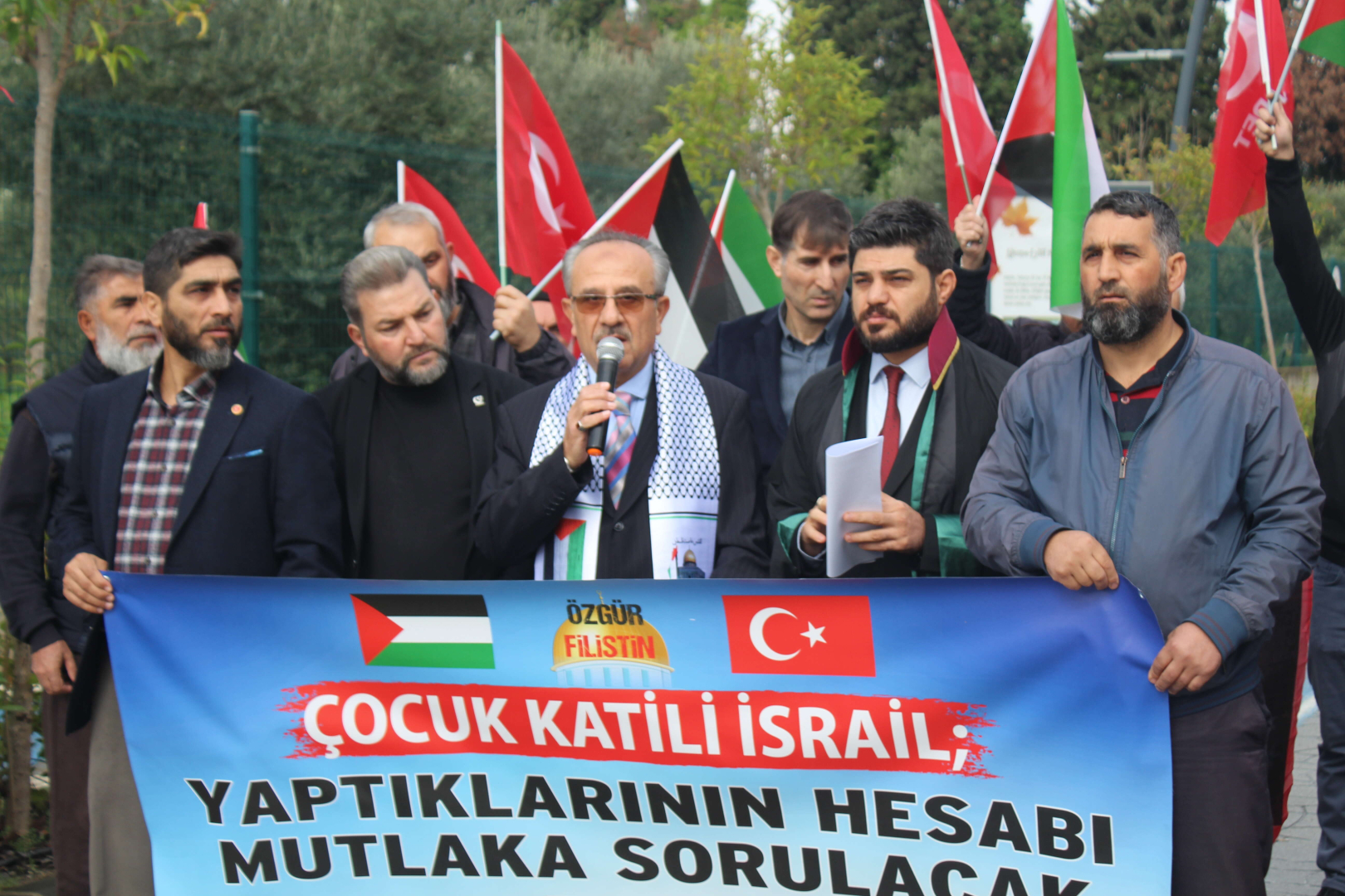 Dünya tarihinin en alçak soykırımına girişen; hastane bombalayan, çocuk katleden İsrail’in ve onun hamisi Amerika’nın elde edebileceği tek şey var: O da yenilmek ve tüm zulümleriyle beraber yeryüzünden silinmektir. Bugün bizler burada, sadece elimizden geleni ortaya koyabiliyoruz. İktidarın icra gücü bizim elimizde olmadığı için adliyeye, hukuka başvuruyoruz. Ancak, günü gelecek, İsrail’e öyle bir tokat atacağız ki, o gün nihayet mazlumların yüzü gülecek ve bir gün inşallah özgür Filistin’de buluşacağız.”