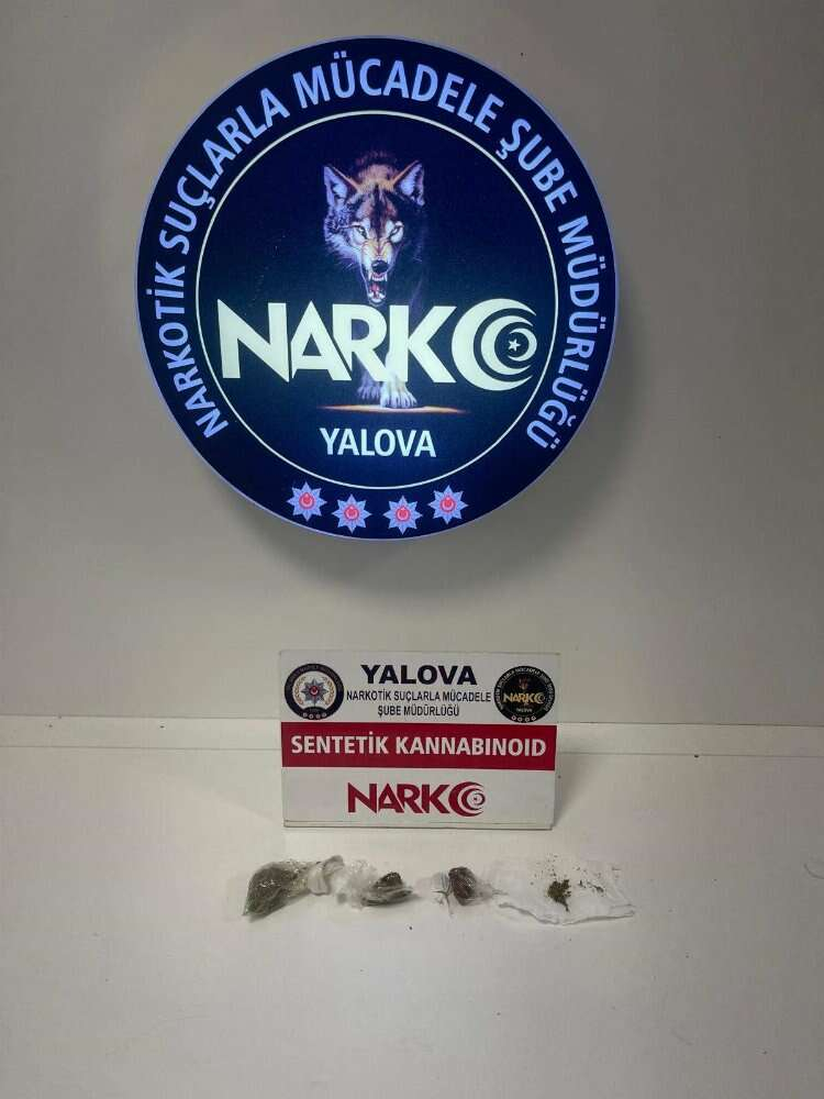 Yalova Emniyet Müdürlüğü, Narkotik Suçlarla Mücadele Şube Müdürlüğü ekipleri, Y.B. ve A.C. isimli şahısların sokak düzeyinde uyuşturucu ticareti yaptığını tespit etti. Şüphelilere yönelik eş zamanlı takibin ardından yapılan baskında Y.B. ve A.C. yakalandı. Yapılan aramalarda satışa hazır 4 fişek halinde 10.50 gram sentetik kannabinoid maddesi ve satışa hazır 12 fişek halinde 16.20 gram sentetik kannabinoid maddesi olmak üzere toplam 26.70 gram sentetik kannabinoid maddesi ele geçirildi. Gözaltına alınan Y.B. tutuklanarak cezaevine gönderilirken, A.C. hakkında adli kontrol şartı tedbir kararı uygulandı.