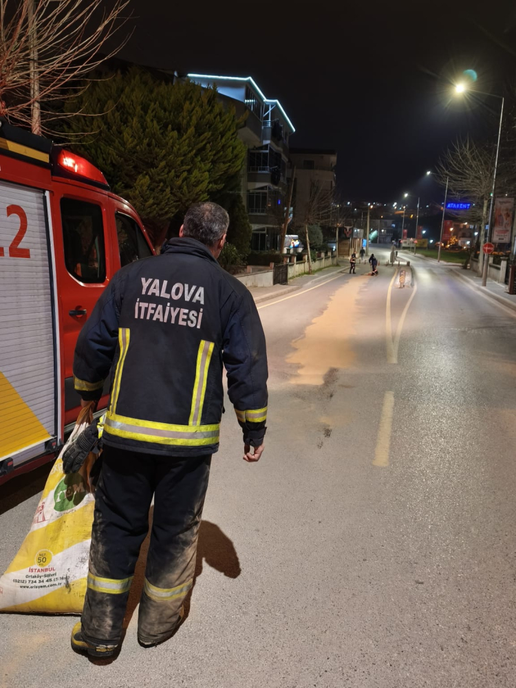 Yalova merkez Vatan Caddesi, Sert Hasan Camii önünde seyir halindeki bir araçtan yola dökülen motor yağı, sürücüler için büyük bir risk oluşturdu. Yol yüzeyinin yağ nedeniyle aşırı kayganlaşması üzerine çevre sakinleri ve sürücüler durumu hemen yetkililere bildirdi. İhbarın ardından kısa sürede olay yerine ulaşan Yalova Belediyesi İtfaiye Müdürlüğü ekipleri, trafiğin yoğun olduğu bölgede yeni bir kaza yaşanmaması için güvenlik önlemlerini artırdı.