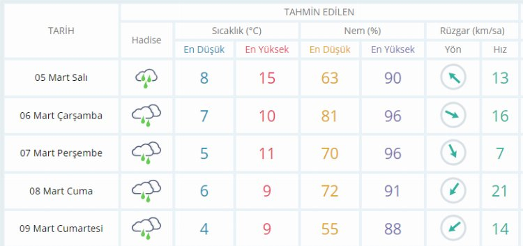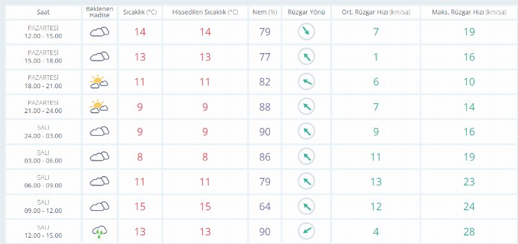 Yalova’yı, 4 Mart Pazartesi günü çok bulutlu ve parçalı bulutlu bir hava beklerken ilerleyen günlerde ise sağanak yağışlı bir hava bekleniyor. Gün içinde 14-12 °C arasında seyretmesi beklenen havanın hafta boyunca 4°C seviyesine düşmesi bekleniyor. Yalova’da gün boyunca tahmin edilen sıcaklık ile hissedilen sıcaklığın aynı olması bekleniyor.