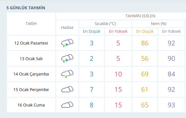 Haftanın ilerleyen günlerinde Yalova’da yağışın etkisini kaybetmesi ve bulutlu bir havanın hakim olması bekleniyor. 15 Ocak Perşembe günü en düşük sıcaklık 7 derece, en yüksek sıcaklık ise 15 derece olacak. 16 Ocak Cuma günü de benzer hava koşullarının devam etmesi öngörülüyor. Cuma günü en düşük sıcaklık 8 derece, en yüksek sıcaklık 15 derece olarak tahmin ediliyor.