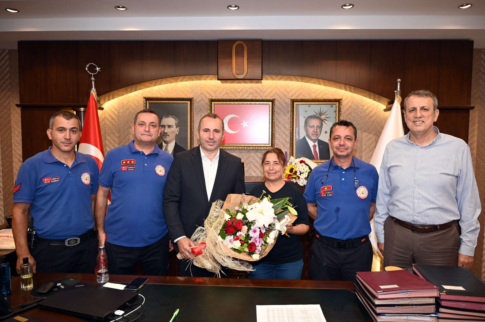 Öte yandan Başkan Tutuk’a ziyaretin anısına çiçek takdim edildi. Çiçeği teslim alan Başkan Tutuk, çiçeği kendisini ziyaret edenler arasında bulunan kadın itfaiye erine hediye etti. Başkan Tutuk’un kadın itfaiye erine olan jesti, tebessüm ettirdi.