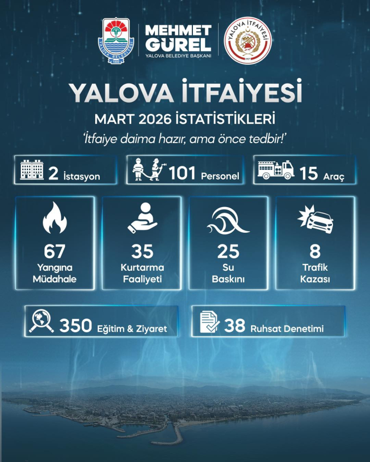Yalova Belediyesi İtfaiye Müdürlüğü, halkın güvenliği için 7 gün 24 saat görev başında. Yalova İtfaiyesi 01-31 Mart 2025 tarihleri arasında 135 olaya müdahale etti.