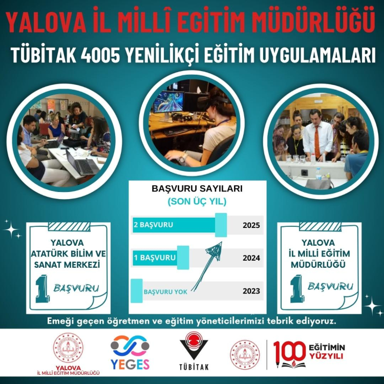 Ayrıca Yalova’da TÜBİTAK Bilim ve Toplum Başkanlığı (BİTO) tarafından desteklenen 4005 Yenilikçi Eğitim Uygulamalar Destekleme Programına da 2023 yılında hiç başvuru yapılmadı. Bu sayı 2024 yılında 1’e yükseldi. 2025 yılına gelindiğinde ise önceki yıla göre yüzde 100 artışla 2 başvuru yapıldı.