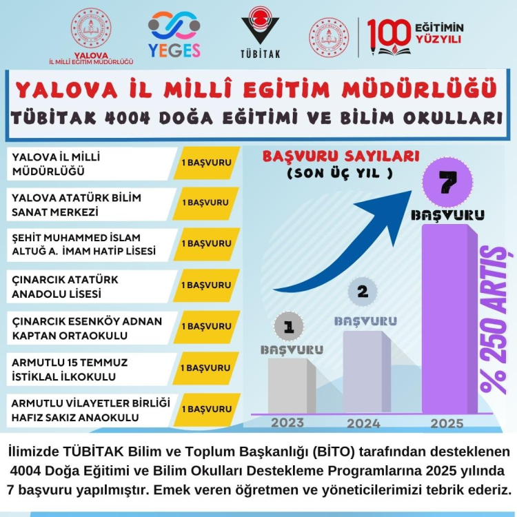 Yalova’da TÜBİTAK Bilim ve Toplum Başkanlığı (BİTO) tarafından desteklenen 4004 Doğa Eğitimi ve Bilim Okulları Destekleme Programına 2023 yılında sadece 1 başvuru yapılmıştı. Bu sayı 2024 yılında 2’ye çıktı. 2025 yılında ise önceki yıla göre yüzde 250 artışla 7 başvuru yapıldı.