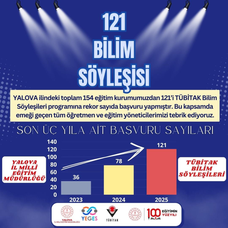 Son olarak Yalova’da TÜBİTAK tarafından düzenlenen Bilim Söyleşileri Programına başvurularda da rekor artış yaşandı. 2023 yılında Bilim Söyleşileri Programına 36 başvuru yapıldı. Bu sayı 2024 yılında 78 oldu. 2025 yılında ise Yalova’da toplam 154 eğitim kurumu Bilim Söyleşileri Programına 121 başvuru gerçekleştirdi.