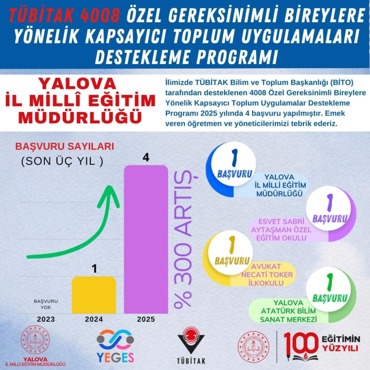 Yalova’da TÜBİTAK Bilim ve Toplum Başkanlığı (BİTO) tarafından desteklenen 4008 Özel Gereksinimli Bireylere Yönelik Kapsayıcı Toplum Uygulamalar Destekleme Programına 2023 yılında hiç başvuru yapılmadı. Bu sayı 2024 yılında 1’e yükseldi. 2025 yılında ise önceki yıla göre yüzde 300 artışla 4 başvuru yapıldı.