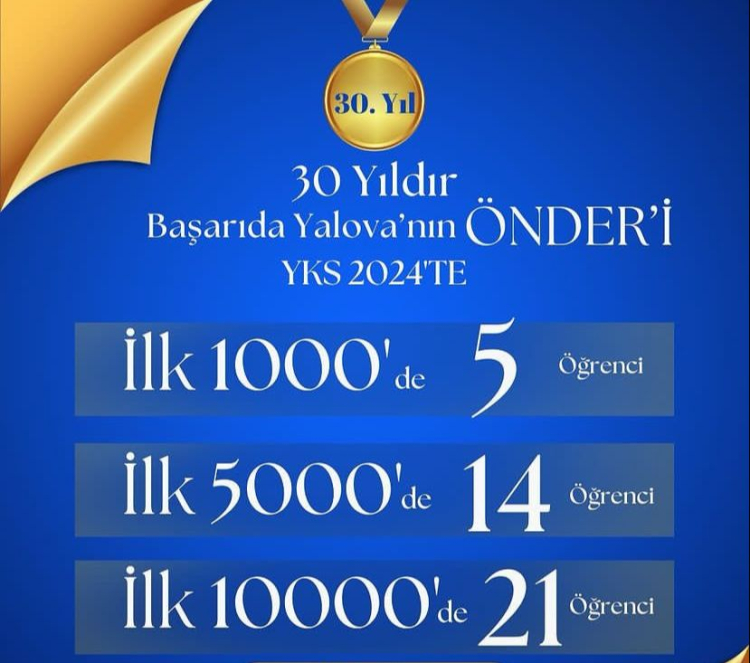 Yalova'nın köklü eğitim kurumlarından biri olan Yalova Önder Özel Eğitim Kursu, 2024 Yükseköğretim Kurumları Sınavı (YKS) sonuçlarıyla büyük bir gurur yaşadı. 30 yıldır Yalova'da eğitim hizmeti sunan dershane, bu yıl Eşit Ağırlık kategorisinde Türkiye genelinde 126. sırada yer alarak, Yalova 1.si oldu. Kursun öğrencileri, YKS 2024’te önemli dereceler elde ederek dikkatleri üzerine çekti.