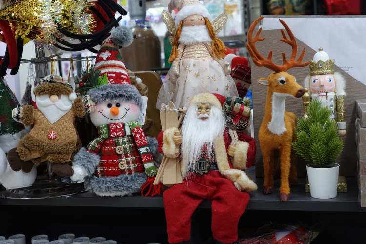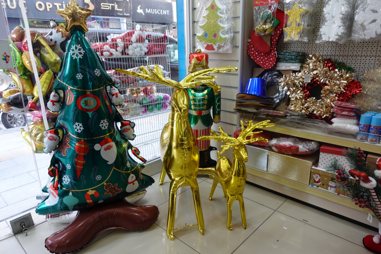 Mağazanın vitrininden içeriye adım atanlar parlak altın renkli geyik figürlerinden şişme yılbaşı ağaçlarına, ışıltılı şapkalar ve dekor ürünlerine kadar geniş bir yelpazede yılbaşı konseptiyle karşılaşıyor.