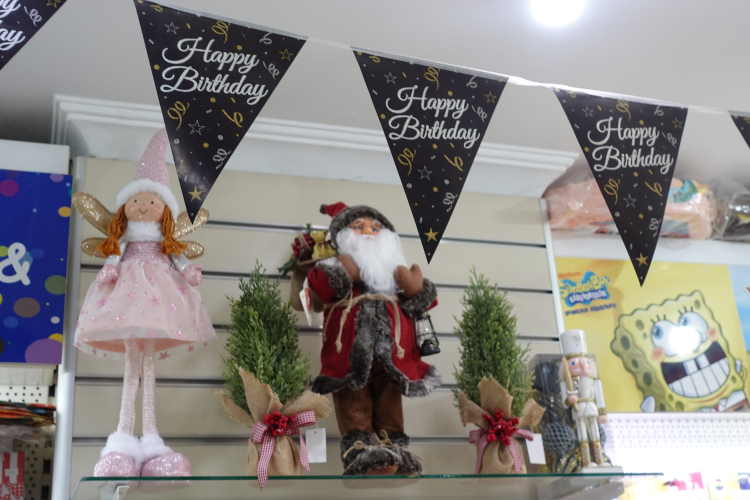 Mağazada yılbaşına özel hazırlanan ürünler göz dolduruyor. Şişme çam ağaçları, altın renkli geyik süsleri, yılbaşı temalı dekorları, masa üstü süsleri ve çeşitli kostümler, yeni yıl ruhunu evlere ve iş yerlerine taşımak isteyenlerin ilk tercihi oluyor.
