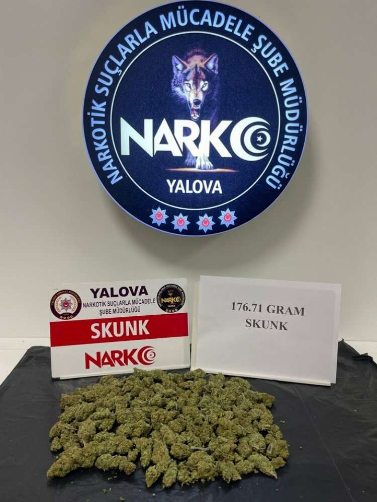 Yalova Emniyet Müdürlüğü’nden yapılan açıklamaya göre, narkotim ekip görevlileri tarafından yapılan istihbarı çalışmalar neticesinde, yakın çevre illerden temin ettikleri uyuşturucu maddeleri kendi sevk ve idarelerindeki 34 plakalı araç ile kente naklederek sokak düzeyinde uyuşturucu madde ticareti yapacakları bilgisi ivedilikle değerlendirmeye alındı. Yapılan çalışmalar neticesinde ekip görevlileri tarafından tespit edilen 34 plakalı araç, yol güzergahında takibe alınarak durduruldu. Adli makamlardan alınan arama kararı gereğince narkotik maddeler arama köpeği Gölge eşliğinde gerçekleştirilen detaylı araç aramasında, 176,71 gram skunk maddesi ele geçirildi. Araç sürücüsü E.Ö. uyuşturucu madde ticareti yapmak suçundan gözaltına alındı.