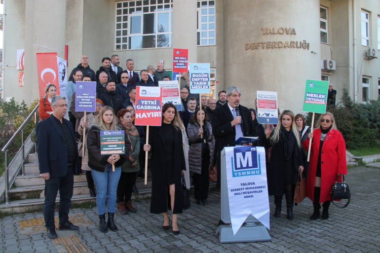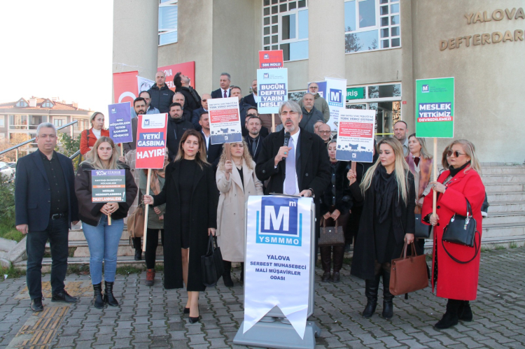 Yalova Serbest Muhasebeci ve Mali Müşavirler Odası (YSMMMO) Başkanı Özkan Yalçın ve yönetim kurulu üyeleri, Yalova Defterdarlığı binası önünde basın açıklaması yaptı. Basın açıklamasına okuyan Özkan Yalçın, “Meslek yetkimiz devredilemez” çağrısında bulundu.