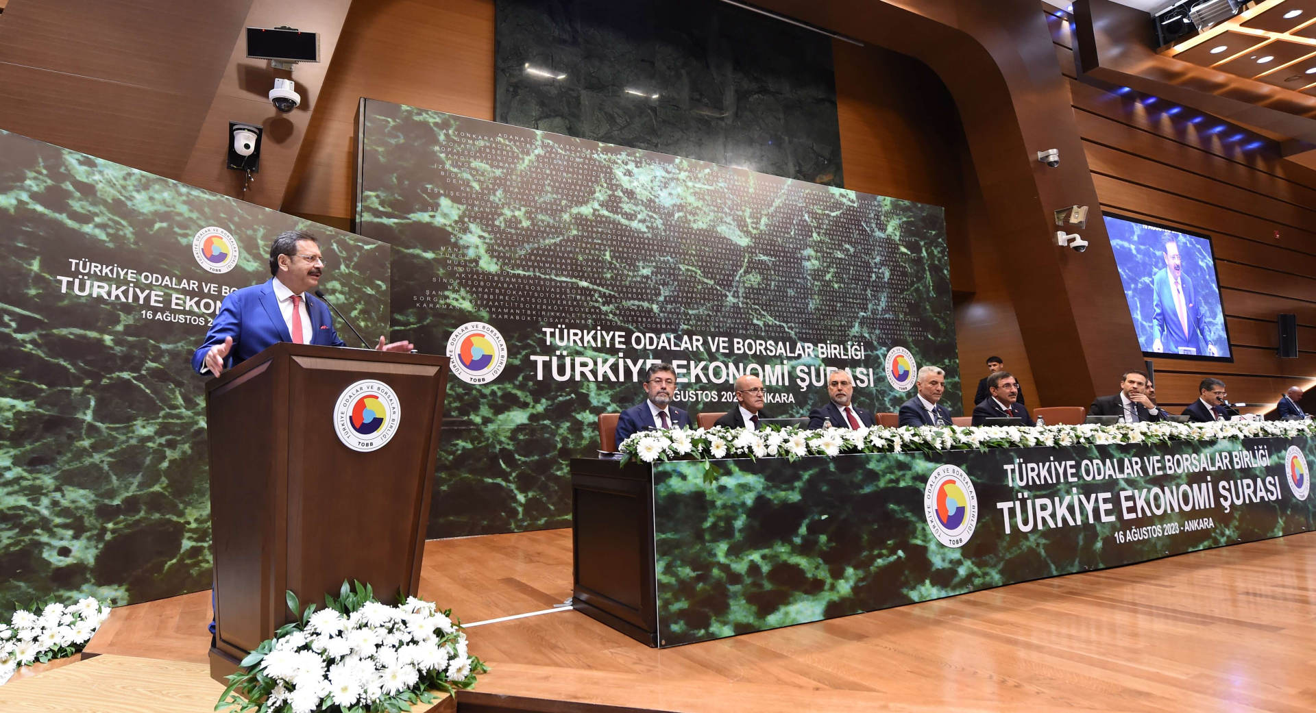 TOBB Başkanı M. Rifat Hisarcıklıoğlu, yaptığı konuşmada Cumhurbaşkanı Recep Tayyip Erdoğan'ın talimatıyla başlatılan ekonomi şuralarının kamu ve özel sektörün bir araya geldiği, sıkıntıların ve önerilerin doğrudan icra makamlarına iletebildiği önemli bir platform olduğunu vurguladı. Hisarcıklıoğlu, geçmişte çözüme kavuşturulan pek çok mesele olduğunu ve bu platformun bu tür sorunların çözümü için etkili bir yol olduğunu belirtti. Ayrıca, TOBB Genel Kurulu'nda Cumhurbaşkanı Erdoğan'dan ekonomi şurasını tekrar toplama talebinde bulunduklarını ve bu talebin uygun görüldüğünü ifade etti.