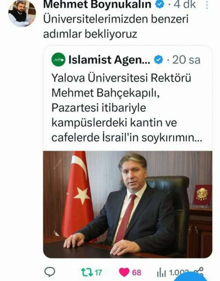 İsrail’in Gazze’ye yönelik saldırıları sonucu masum sivillerin hayatını kaybetmesi, Türkiye’de ve dünyada büyük bir tepkiyle karşılandı. Birçok kurum ve kuruluş, İsrail ve destekçilerinin ürünlerine boykot çağrısı yaptı. Bu çağrılara katılanlardan biri de Yalova Üniversitesi oldu. Yalova Üniversitesi Rektörü Prof. Dr. Mehmet Bahçekapılı, sosyal medya hesabından yaptığı paylaşımda, üniversite olarak İsrail ve destekçilerinin ürünlerini satmama kararı aldıklarını açıkladı. Bahçekapılı, “Gençler; pazartesiden itibaren kantin ve kafelerde bu tür ürünler satılmayacaktır. Bu kararımız, İsrail’in Gazze’deki katliamlarına karşı bir tepki ve dayanışma göstergesidir. Üniversite olarak Filistin halkının yanındayız ve haklı davalarını destekliyoruz” ifadelerini kullandı.