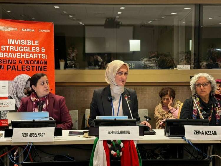 Kadın ve Demokrasi Vakfı (KADEM) de New York'un en işlek alanlarından Times Meydanı'nda İsrail’i protesto etti. "Filistinli kadınların yanındayız" mesajı veren Kadın ve Demokrasi Vakfı’nın sözcülüğünü ise Yalova Üniversitesi Hukuk Fakültesi Öğretim Üyesi ve KADEM Yönetim Kurulu Başkanı Doç. Dr. Saliha Okur Gümrükçüoğlu yaptı.