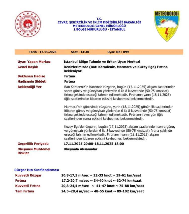Meteoroloji verilerine göre, Marmara Denizi’nin güneyinde rüzgarın 18 Kasım Salı sabah saatlerinden itibaren güney ve güneybatı yönlerden 6 ila 8 kuvvetinde (50–75 km/saat) fırtına şeklinde eseceği öngörülüyor. Fırtınanın aynı gün öğle saatlerinden sonra etkisini yitirmesi bekleniyor.