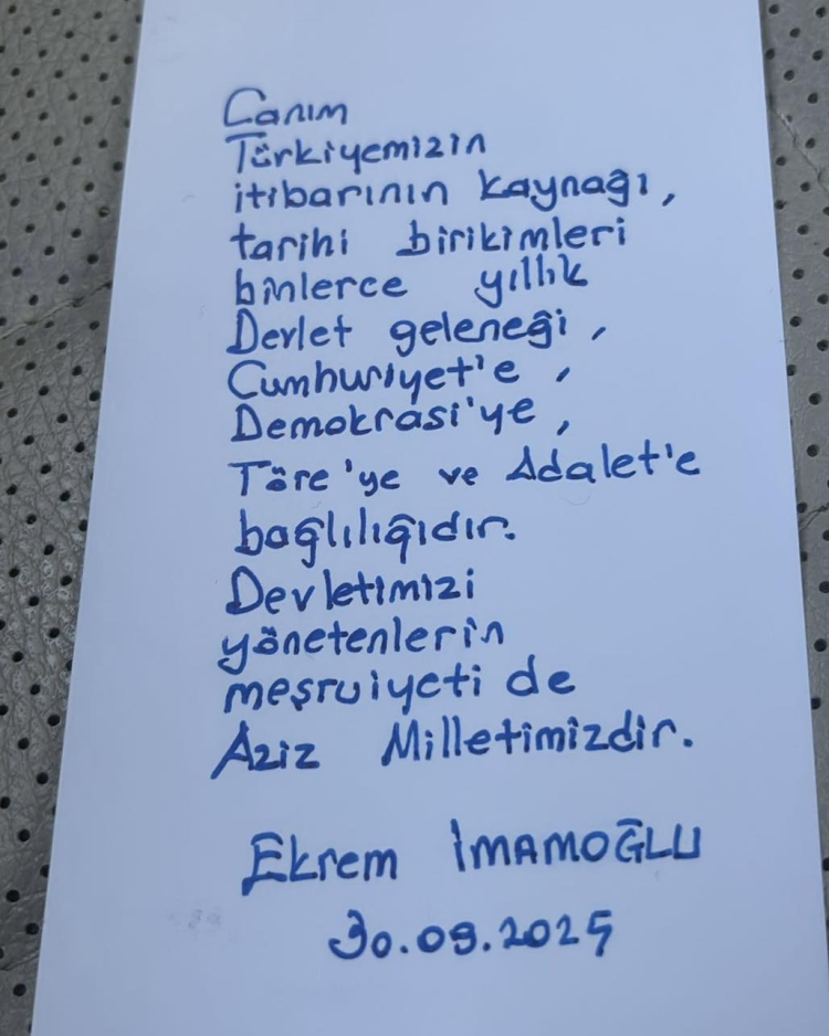 Söz konusu paylaşımlar, ziyaretin ardından geniş yankı uyandırırken, Ekrem İmamoğlu’nun notunda yer alan ifadeler alkış topladı. İmamoğlu’nun sözleri şu şekilde idi, ‘’Canım Türkiyemizin itibarının kaynağı, tarihi birikimleri, binlerce yıllık devlet geleneği, Cumhuriyet’e, Demokrasi’ye, Töre’ye ve Adalet’e olan bağlılığıdır. Devletimizi yönetenlerin meşruiyeti de Aziz Milletimizdir.’’