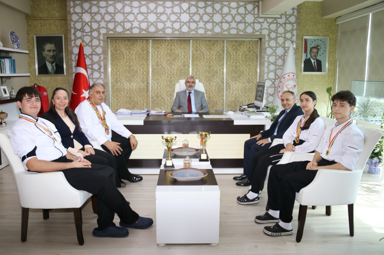 Şaban Temuge Mesleki ve Teknik Anadolu Lisesi Müdürü Ferhat Karataş, Müdür Yardımcısı Berrin Ertop, Usta Öğretici Ferit Doğan ve dereceye giren öğrenciler Mustafa Varol, Mümin Ahmet Nazır ve Ele Göçer, İl Millî Eğitim Müdürü Aytekin Yılmaz’ı makamında ziyaret etti.
