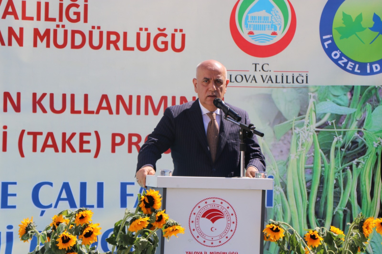 Yalova İl Tarım ve Orman Müdürü Mustafa İlmeç ise TAKE Projesi kapsamında yürütülen çalışmaların önemine değinerek, “Bugün burada, Tarım Arazilerinin Kullanımının Etkinleştirilmesi Projeleri kapsamında ilimizde hayata geçirilen iki önemli çalışmanın, yağlık ayçiçeği ve çalı fasulyesi tohum temini programının teslim töreni vesilesiyle bir araya gelmiş bulunuyoruz” ifadelerini kullandı. Yalova’nın yüzölçümünün yüzde 27’sinin tarım alanı olduğunu belirten İlmeç, bu alanların önemli bir kısmının henüz kullanılmadığına dikkat çekerek, “Bu rakamlardan görüyor ki tarım alanlarımızın önemli bir kısmı boş kalmaktadır. Geçmiş yıllarda pandemiyle, savaşlarla tarım sektörünün ve gıdanın öneminin anlaşıldığı dönemde Sayın Cumhurbaşkanımızın ‘Ekilmedik bir karış tarım arazisi kalmasın’ talimatı olmuştu” dedi.