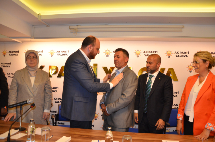 Basın toplantısının sonunda AK Parti’ye katılan Altınova Belediyesi Meclis Üyesi Gazi Yılmaz’a parti rozetini Ahmet Büyükgümüş taktı.
