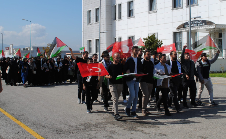 Siyonist İsrail rejiminin Gazze’ye yönelik soykırımının birinci yıldönümünde, Türkiye’nin birçok kentinde protesto gösterileri devam ediyor. Bu kapsamda, Yalova Üniversitesi öğrencileri de, düzenledikleri protesto yürüyüşüyle seslerini duyurdu. Etkinlikte, öğrenciler “Gazzeli mazlumların yanındayız” vurgusuyla, Gazze’de yaşanan insanlık dramına dikkat çekti. Yürüyüş boyunca çeşitli pankartlar açan öğrenciler, İsrail’in saldırılarına karşı lanet yağdırdı.