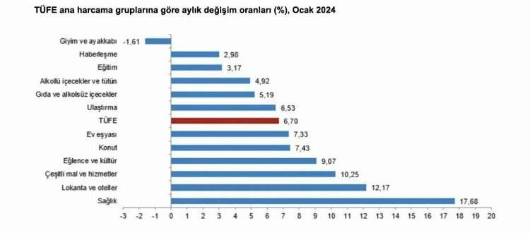 Buna karşılık olarak 2024 yılı Ocak ayında, 2023 aralık ayına göre artışın en yüksek olduğu ana grup ise yüzde17,68 ile sağlık grubu oldu.