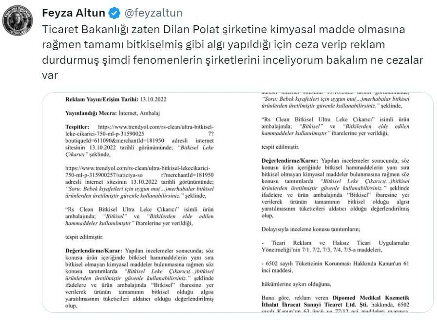 Feyza Altun tarafından sosyal medya hesabı üzerinden yapmış olduğu açıklamaya göre Engin Polat ve Dilan Polat çiftinin şirketi olan firmanın satışını yaptığı ürünle ilgili sıkıntı olduğu tamamen bitkisel denilmesine rağmen ürünlerin içerisinde kimyasal maddelerin saptanması sebebi ile durdurulduğunu belirtti.
