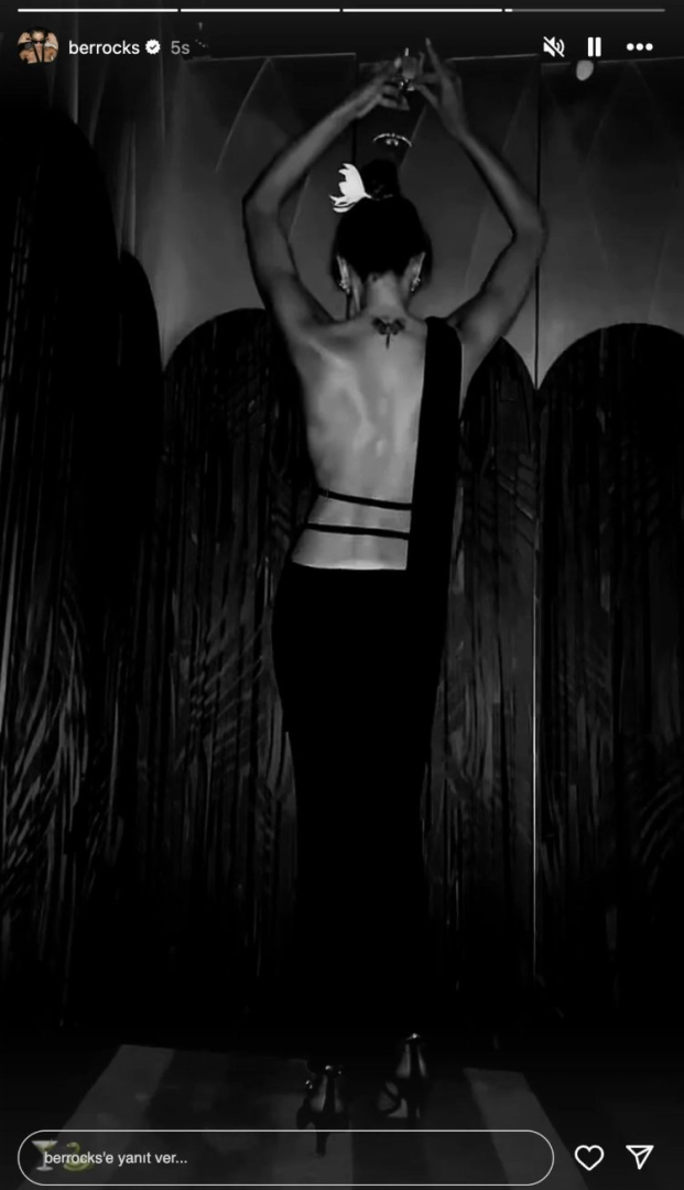 Derin sırt dekolteli elbisesiyle fotoğrafını ve dansını paylaşan Tüzünataç, paylaşımlarında siyah-beyaz bir efekt kullandı.