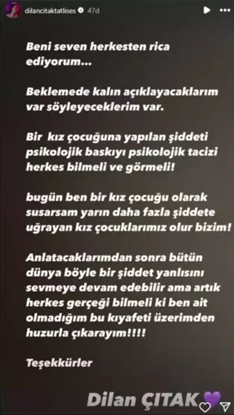 Çıtak sosyal medya hesabından yaptığı paylaşımda, “Bir kız çocuğuna yapılan şiddeti, psikolojik baskıyı, psikolojik tacizi herkes bilmeli ve görmeli. Bugün ben bir kız çocuğu olarak susarsam yarın daha fazla şiddete uğrayan çocuklarımız olur.