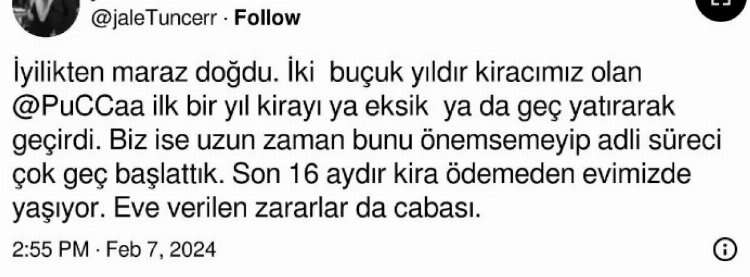 Ev sahibi ayrıca Pucca’ya dava açtığını ve 12 aydır mahkeme sürecinin devam ettiğini de belirtti. Jale Tuncer isimli ev sahibi, evin Nişantaşı'nda ve 3+1 olduğunu ve kiranın 2023'te 10.500 TL olduğunu da sözlerine ekledi.