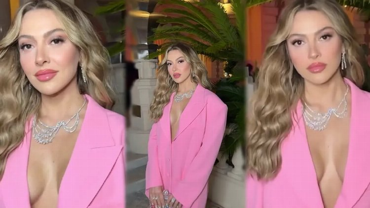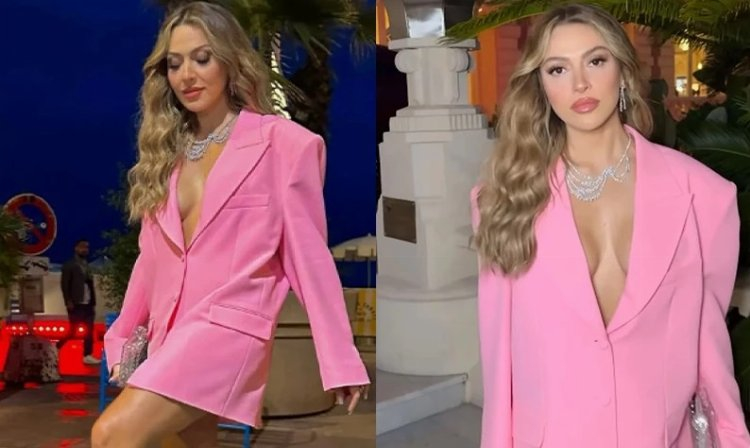 Ünlü şarkıcı, Cannes’in akşam etkinliği için tercih ettiği pembe ceketiyle dikkat çekti. Ceketinin içine hiçbir şey giymeyen ve oldukça derin bir dekoltesi olan Hadise'nin bu tarzına sosyal medyada yorum ve beğeni yağdı.