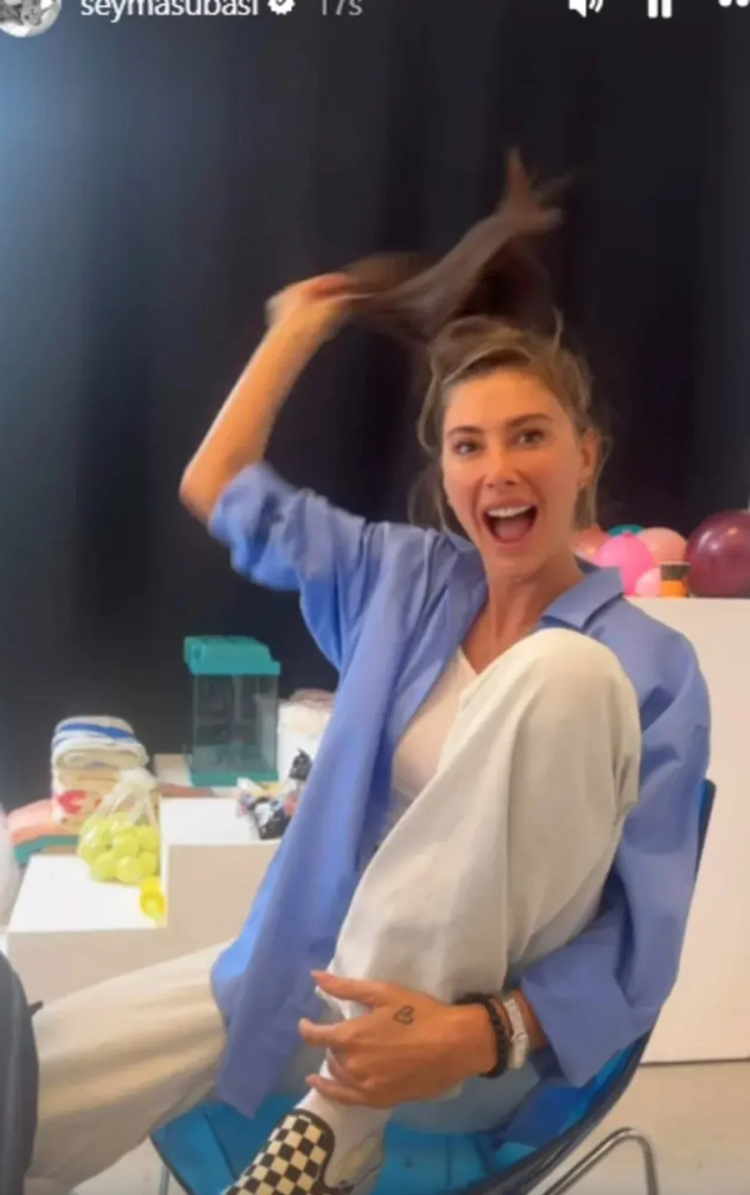 Sarı ve uzun saçlarıyla bilinen fakat çekim için peruk takan Şeyma Subaşı, hemen peruğu çıkararak saçlarının yerinde olduğunu da gösterdi.