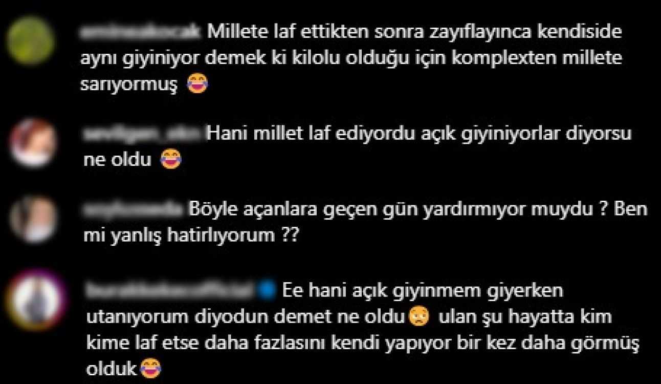 “Millete laf ettikten sonra zayıflayınca kendisi de aynı giyiniyor. Demek ki kilolu olduğu için kompleksten millete sarıyormuş.”