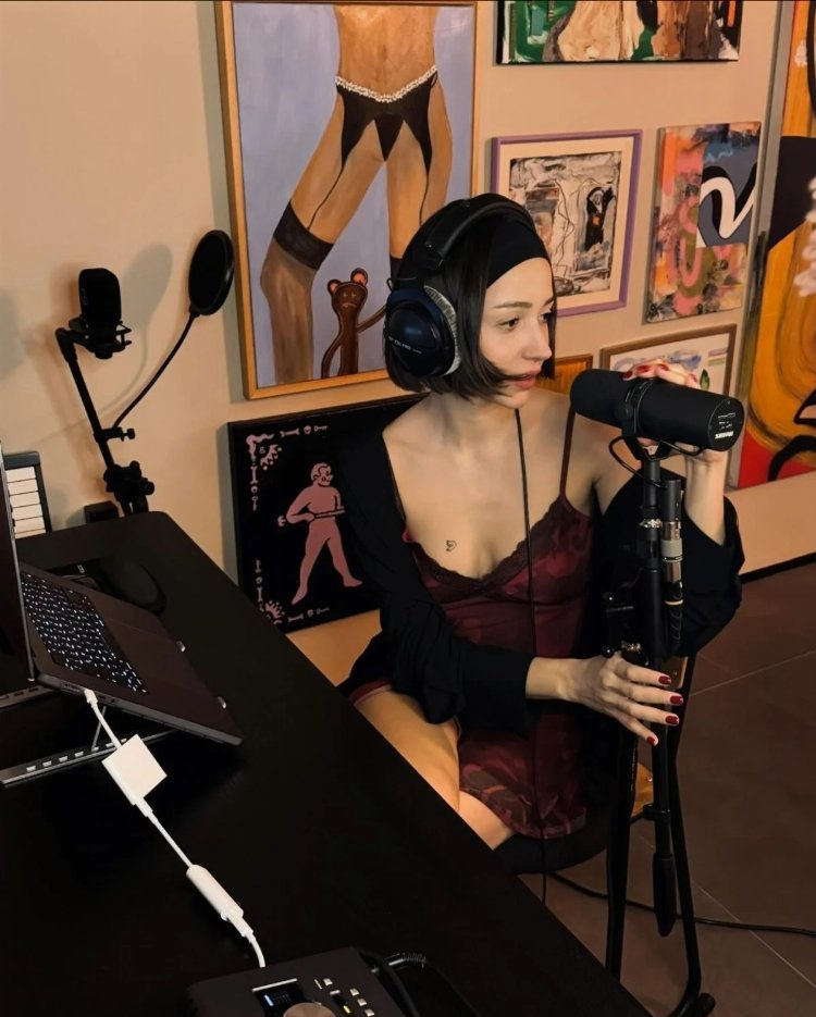 Zeynep Bastık, dantel geceliği ile şarkı kaydı alırken objektiflere poz vermeyi ihmal etmedi ve o anlarını takipçileri ile paylaştı.