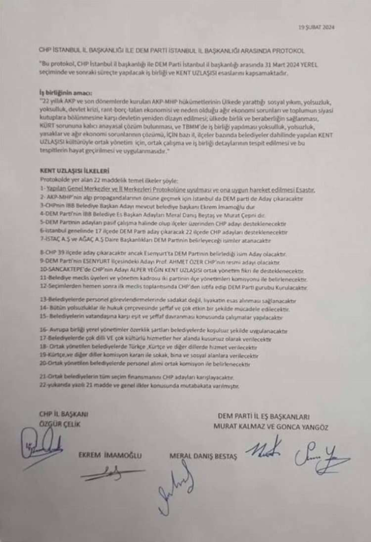 Sahte protokolde CHP İstanbul İl Başkanı Özgür Çelik, Dem Parti İl Eş Başkanları Murat Kalmaz ve Gonca Yangöz, İBB Başkanı ve adayı Ekrem İmamoğlu, DEM Parti İBB Adayı Meral Danış Beştaş’ın imzaları taklit edildi.
