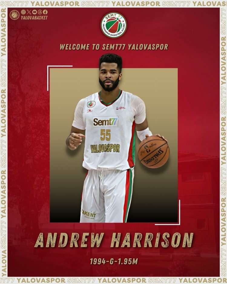 Andrew Harrıson, 1994 doğumlu ve 1.95 boyundadır. Harrıson bu sezon Yunan Ekibi, PAOK BC’de lig de 16 ve Basketbol Şampiyonlar Ligi’nde 9 maç olmak üzere toplam 25 maçta ortalama 27.8 dakika süre aldı ve 12.4 sayı, 3.0 ribaund, 3,0 asist ve 0.6 top çalma ortalamaları tuttu. Amerikalı guard, 151 maçlık NBA kariyeri boyunca Memphis Grizzlies, Cleveland Cavaliers, New Orleans Pelicans formaları giydi. Semt77 Yalovaspor Basketbol Takımı tarafından yapılan açıklamada “Khimki formasıyla EuroLeague, Yukatel Merkezefendi formasıyla Basketbol Süper Ligi deneyimi yaşayan Andrew Harrison'a, tekrardan şehrimize ve takımımıza hoş geldin diyoruz” diye belirtildi.