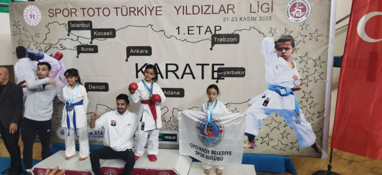 Çiftlikköy Belediyespor Kulübü, 22 Kasım’da gerçekleştirilen Türkiye Yıldızlar Ligi’nde 25 sporcu ile 25 madalya kazanarak turnuvaya damga vurdu. Halil İbrahim Yüksektepe’nin öğrencileri tatamide fırtına gibi eserek11 birincilik elde ederken, toplamda kazanılan 25 madalya, Çiftlikköy Belediyespor karatecilerinin turnuvadaki başarısını ortaya koydu.