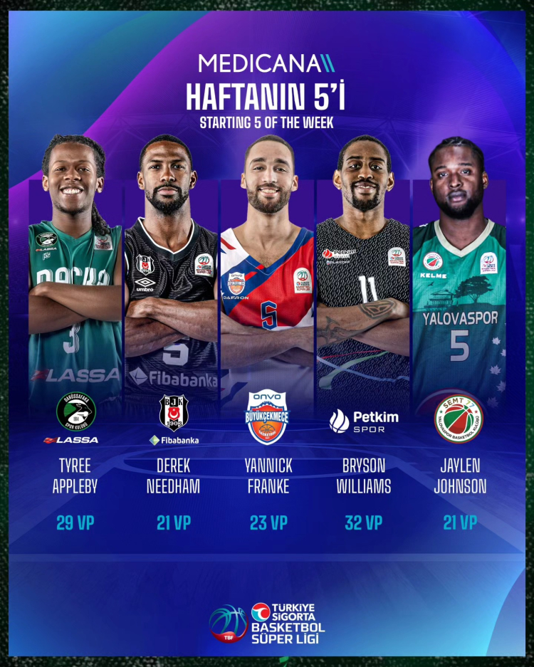 Türkiye Sigorta Basketbol Süper Ligi’nde heyecan dolu 15. hafta maçları tamamlanırken, Türkiye Basketbol Federasyonu (TBF) tarafından belirlenen ‘Haftanın Beşi’ listesi de yayınlandı. Yalovaspor’un Amerikalı oyuncusu Jaylen Johnson da Manisa Basket karşısında sergilediği 20 sayı ve 8 ribaundlık performansla listede yer aldı.