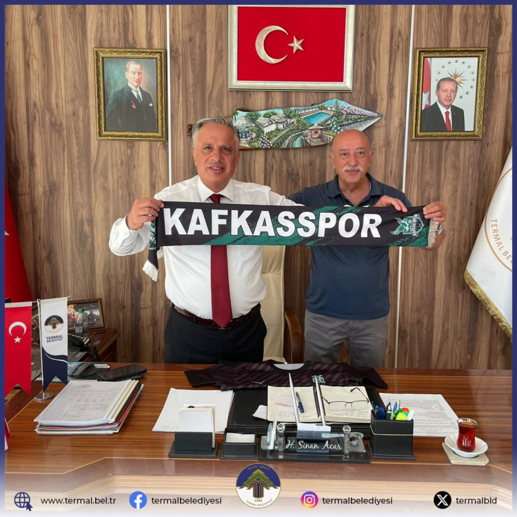 Kafkas Spor Kulübü’nün önemli büyüklerinden Şahin Derlek, başkanlara ziyaretlerini gerçekleştirmeye devam ediyor. Bu kapsamda Termal Belediye Başkanı H. Sinan Acar gelen ziyaretçilerini makamında ağırlamayı tüm hızıyla sürdürüyor.