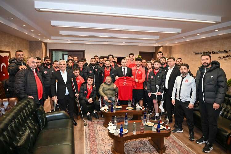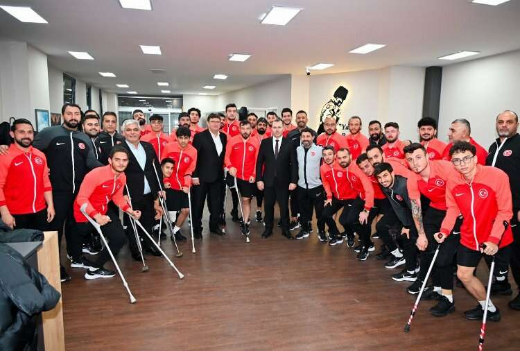 Fransa’da haziran ayında gerçekleştirilecek olan Ampute Futbol Avrupa Şampiyonası hazırlıkları çerçevesinde Yalova’da kampa giren Türkiye Ampute Futbol Milli Takımı hazırlıklarını tamamladı. Yalova’dan ayrılmadan son ziyaretlerini Yalova Belediye Başkanı Mustafa Tutuk’a yapan millilere Türkiye Bedensel Engelliler Spor Federasyonu (TBESF) Başkanı Alparslan Erkoç da eşlik etti. Milli takımı makamında konuk eden Yalova Belediye Başkanı Mustafa Tutuk, Türkiye Ampute Futbol Milli Takımı’na Avrupa Şampiyonasında başarılar diledi.