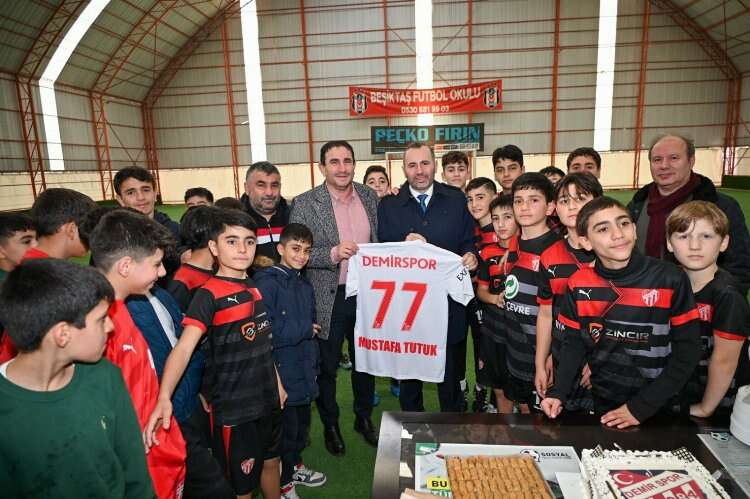 İlk olarak Demirspor altyapı oyuncularının antrenmanını ziyaret eden Başkan Tutuk’a, AK Parti Belediye Meclis Üyesi Nusret Karaalioğlu ile birlikte Amatör Spor Kulüpleri Federasyonu Başkanı Tamer Erbul da eşlik etti. Demirspor ziyaretinde altyapı oyuncularıyla bir araya gelen, tatlı ikramında bulunan Başkan Tutuk, gelecek vaat eden genç futbolcularla birlikte pasta kesti. Ardından gençlerin isteklerini kırmayan Başkan Tutuk, gençlerle fotoğraf çektirdi. Demirspor Başkanı Talip Bayburtlu Başkan Tutuk’a adının yazılı olduğu forma hediye etti.